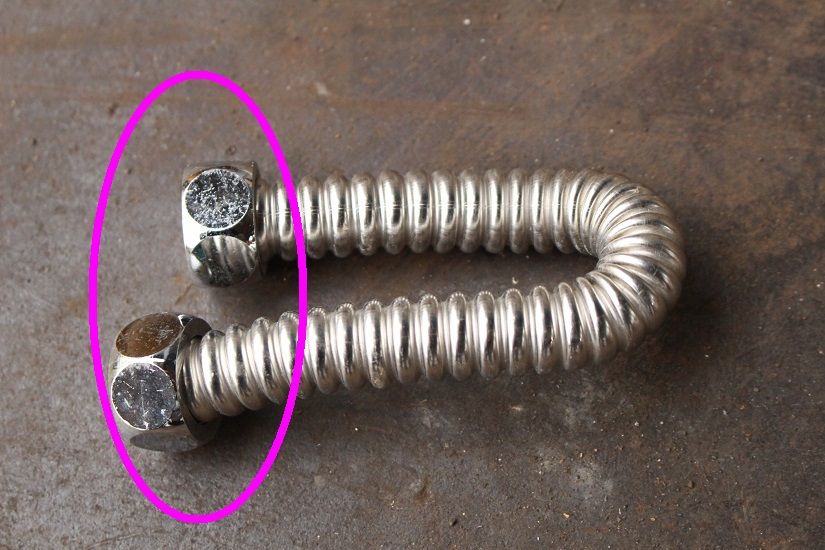 ・蛇腹状のパイプがステンレス製、両端のナット部分が真鍮 -